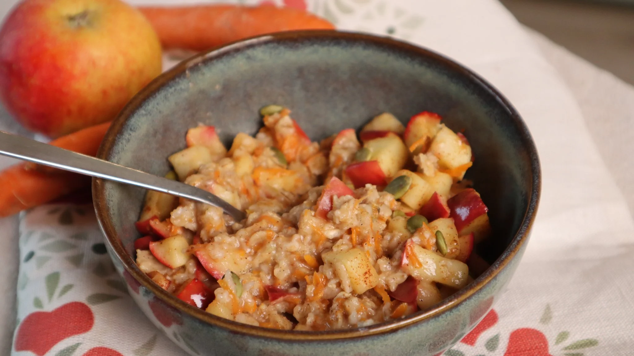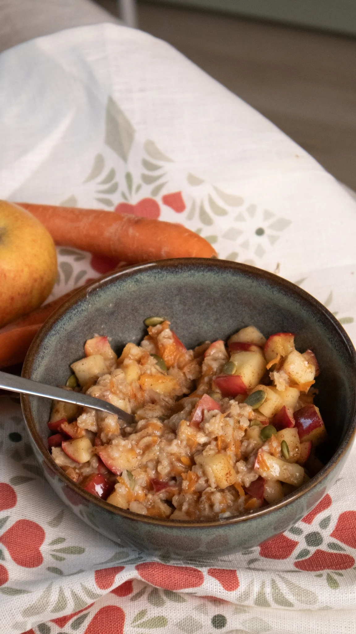 En varm och härlig gröt inspirerad av smaken av morotskaka – enkel att svänga ihop och lika god till vardag som helg. En mysig start på dagen med naturlig sötma och kryddig värme.